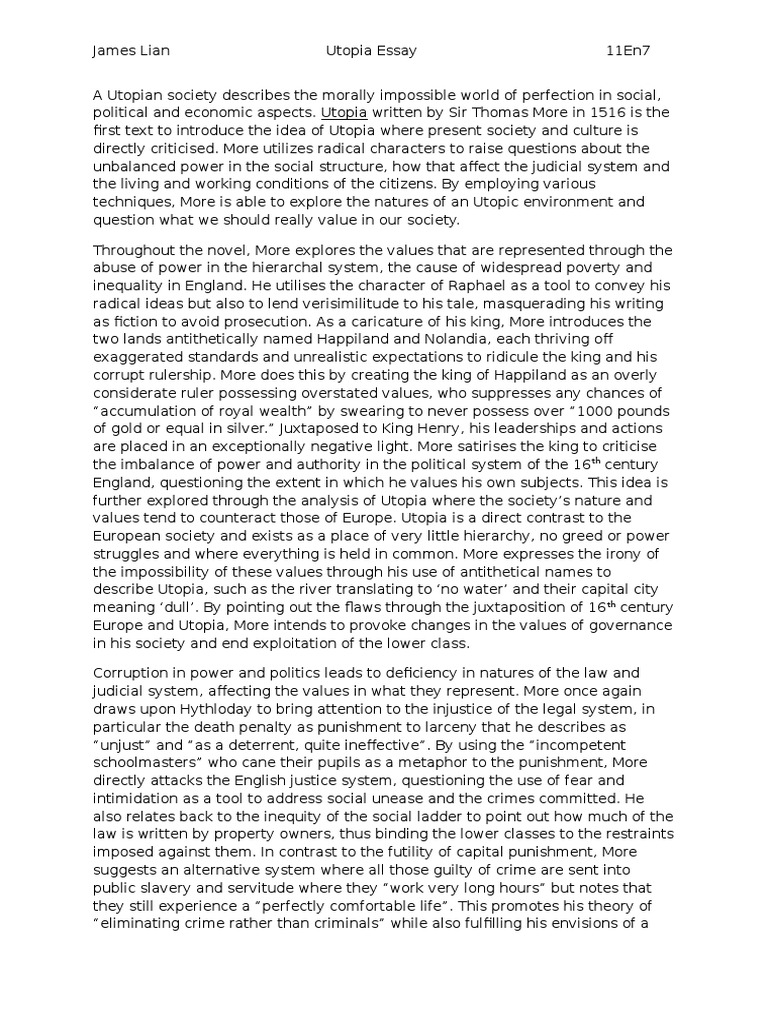 According to Hythloday, my utopia essay, the cities are almost indistinguishable from each other. They have virtually the same populations, architecture, layouts, my utopia essay, and customs. Inhomogeneity, More visualizes an end to injustice and inequality. Further, More imagines a homogenous community as being a rational community. Such a concept necessarily assumes that all rational thought leads in the same direction, toward the same eternal truths. Also, it posits that in matters of social theory there are single, definite truths to be found, which we know not to be the case. No work will be done and without work, not enough food is produced to feed the people.